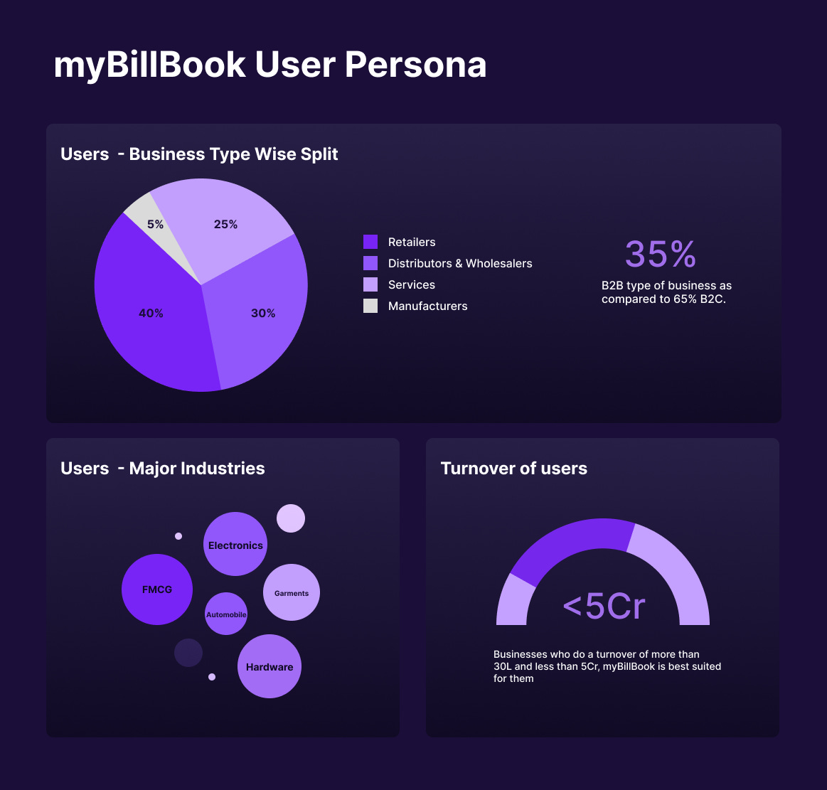 š” Our users at myBillBook were small businesses generating an annual turnover between ā¹30 lakh to ā¹5 crore. This represent a broad spectrum of the Indian economy. These businesses can be categorized based on two primary classifications: the nature of their business (retailers, distributors, wholesalers, manufacturers, and service providers) and their industry domain (FMCG, electronics, garments, pharma, hardware, automobile, etc).