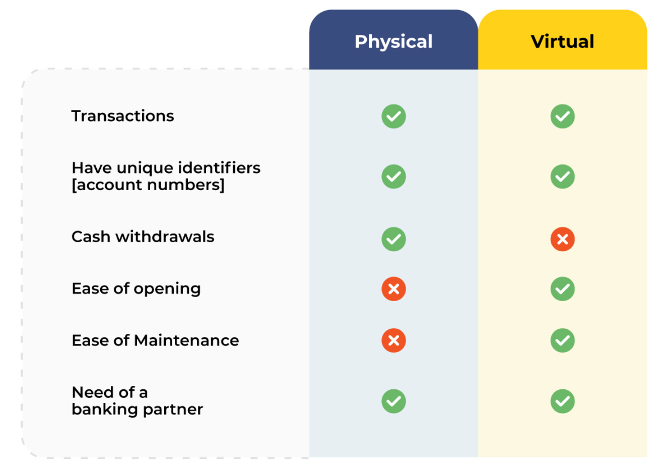 A virtual accountās operating and maintenance costs are significantly lower than physical accounts. Itās easy for a business to open hundreds to thousands of virtual accounts while doing the same for physical accounts would be nothing short of a nightmare.