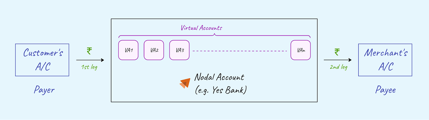 In our case, since we were collecting money not for ourselves but on behalf of our merchants, it made sense to create Virtual Accounts on top of a Nodal Account. This ensures that money does not legally belong to the us, at any point in time and acts as a trust factor.