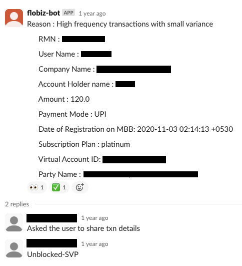 We blocked Level 1 and 2 merchants the moment their transaction fell in the gambit of our anti-fraud rule engine. We offered a second chance to Level 1 merchants, by empowering our Operations team to manually review their cases.