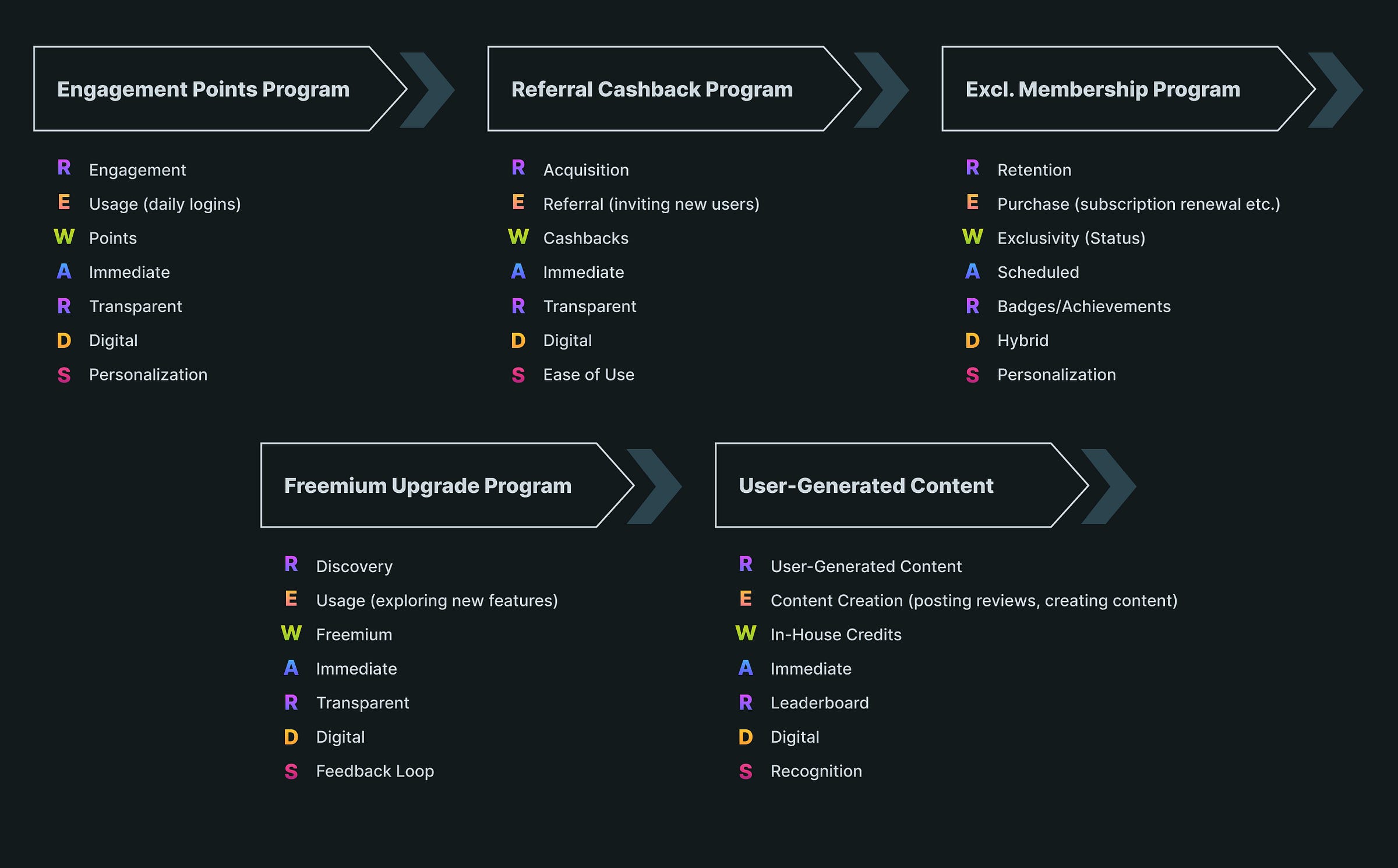 By mixing and matching different values from each block, you can create a customized rewards program tailored to your business goals and user motivations.