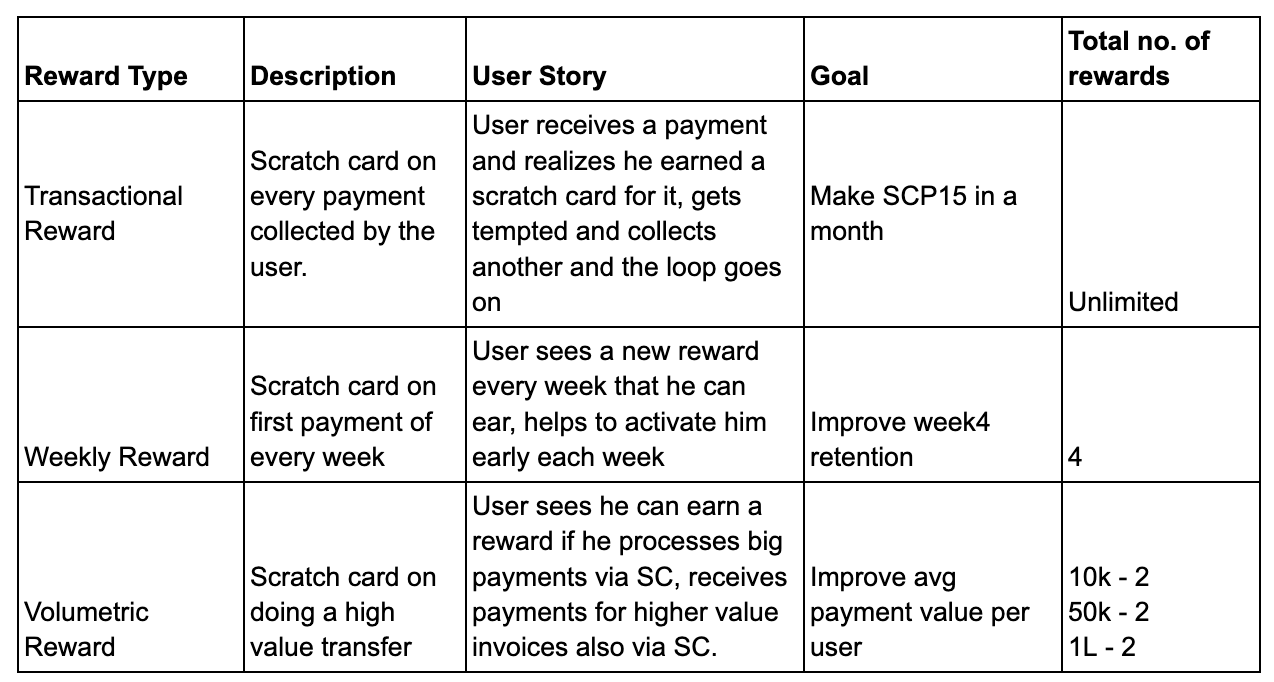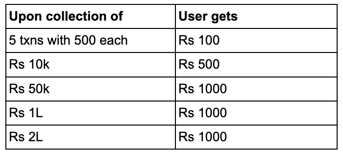 You can see an addition of a new category - “5 txns with 500 each”, we wanted to be more direct with respect to our retention goals. However we were cognizant of the fact that these 5 payments have to legitimate payments and shouldn’t be gamed by transferring Rs 1 worth of payment 5 times and earning 100 Rs for the same.