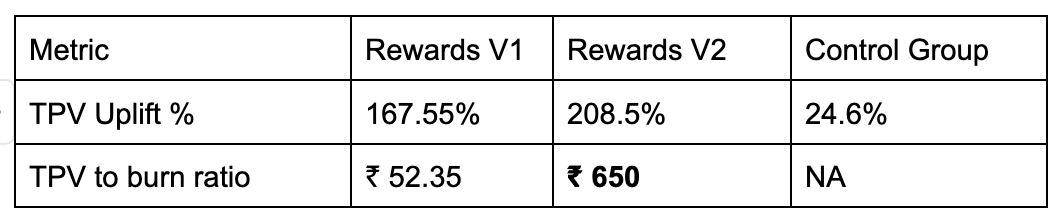 We can clearly see that Rewards V2 had a higher impact on our TPV while being significantly cheaper (atleast 12x).