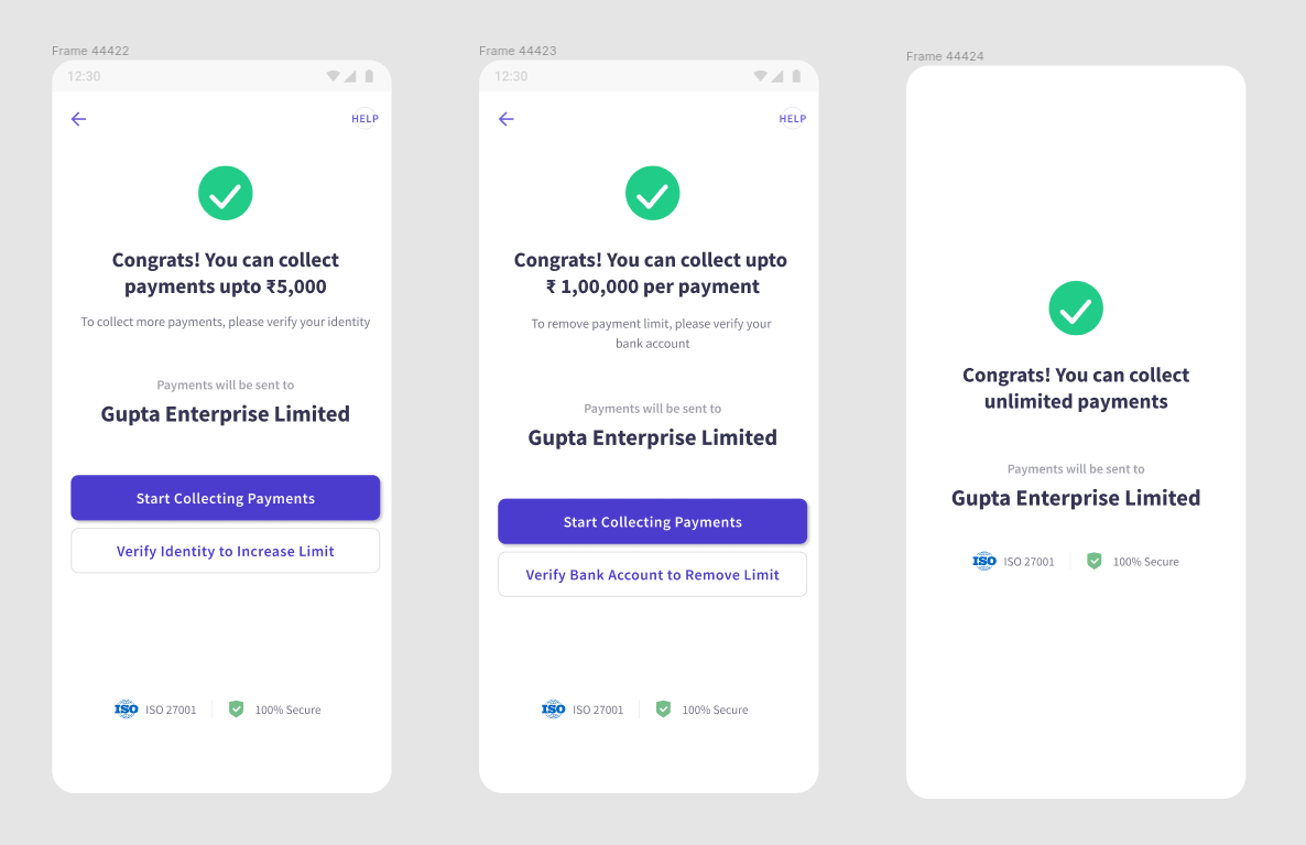 India’s micro and small business owners were truly introduced to the internet only after Jio’s launch in 2016. Over the years, they slowly learnt to use YouTube and Instagram, but even by the launch of myBillBook in 2020, the internet had yet to become a mainstay of their business. Their trust in an online software’s ability to store their accounting data securely was nascent, further compounded by the fact that traditional accounting softwares like Tally had been completely on-device. In myBillBook’s pre-PMF days, we discovered that repeatedly reassuring users that their data while online, was stored securely with us, helped address this concern and improved adoption. So for each screen of the KYC journey of SC, we reminded merchants of our ISO 27001 certification and that our app was 100% secure.
