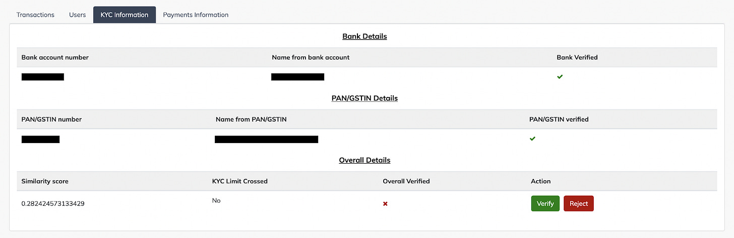 CS agents could see unverified KYC details of merchants on an internal tool and approve or reject their KYC using the extra documents that merchants provided.